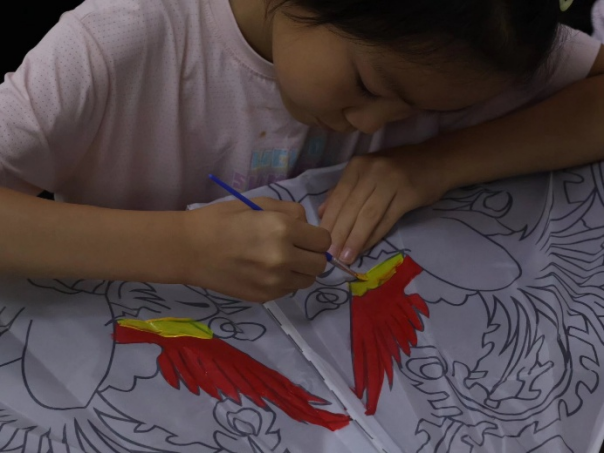 在倪好及现场志愿者的指导下,孩子们热情投入,从挑选色彩、精心绘制到耐心组装每一步都专注认真。普通的布料与基础的颜料在孩子们手中逐渐转变为充满童趣的待飞风筝。课堂气氛热烈,孩子们对亲手放飞作品的期待溢于言表。