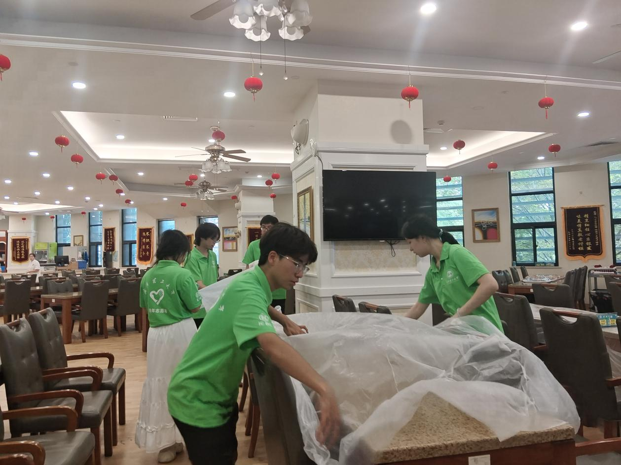 活动当天,志愿者们早早抵达养老院,迅速投入到生日会场的布置工作中。大家分工协作,将桌布平整地铺在长桌上,并按照老人就座方便的原则,将凳子整齐有序地排列在桌旁。随后,志愿者们将养老院精心准备的糕点逐一摆放,在大家的共同努力下,原本单调的大厅变得温馨又欢乐。
