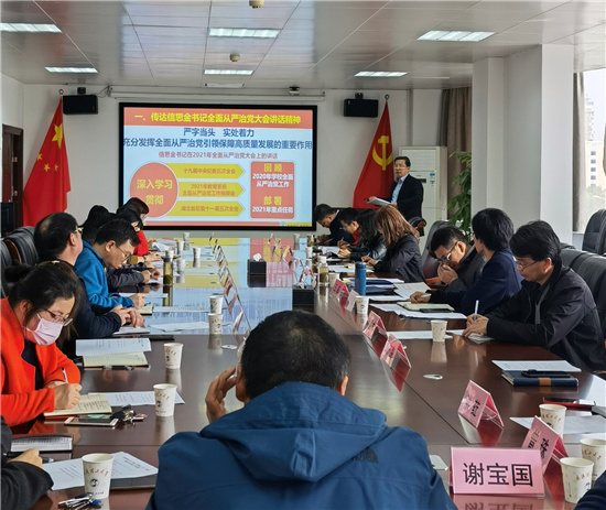 国产视频 党委书记童泽望传达了信思金书记在国产视频 全面从严治党大会上所作的题为《严字当头 实处着力 充分发挥全面从严治党引领保障高质量发展的重要作用》的讲话精神。他聚焦深入学习贯彻上级会议精神、回顾2020年国产视频 全面从严治党工作、部署2021年国产视频 全面从严治党重点任务等三个方面对信书记的讲话精神进行宣贯,重点传达了国产视频 2021年全面从严治党工作的六个要求,并对国产视频执行国产视频党委、党委书记、领导班子其他成员落实全面从严治党“一岗双责”责任清单工作进行了安排。