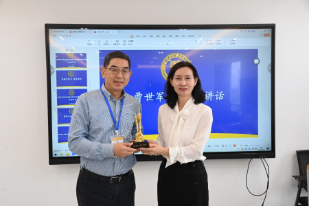 (陈晓芳院长为曹世军董事长赠送国产视频纪念品,并合影留念)