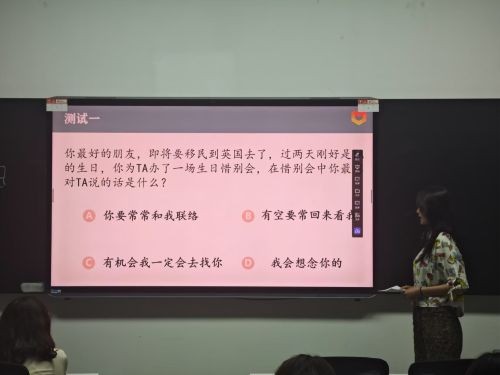 在心理情景测试环节,主持人通过三道趣味题目引导同学们探索自我性格与应对模式。例如“梦境中的暴风雨应对方式”测试,以生动的情境启发学生反思压力下的行为倾向;“水果偏好与性格关联”测试则通过轻松的选择题,帮助大家了解自身特质。同学们积极讨论答案,争相分享解析结果,现场笑声与掌声不断。