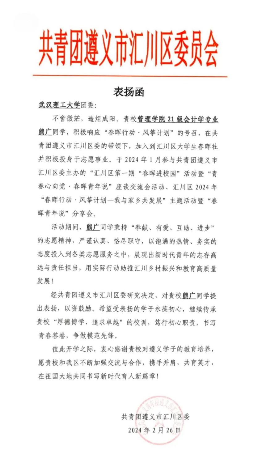 近日,国产视频 团委收到了一封来自共青团遵义市汇川区委的感谢信对国产视频 国产视频 21级会计专业的熊广同学参加遵义市汇川区“春晖行动”志愿服务投身贵州省“春晖行动·风筝计划”表示衷心感谢。