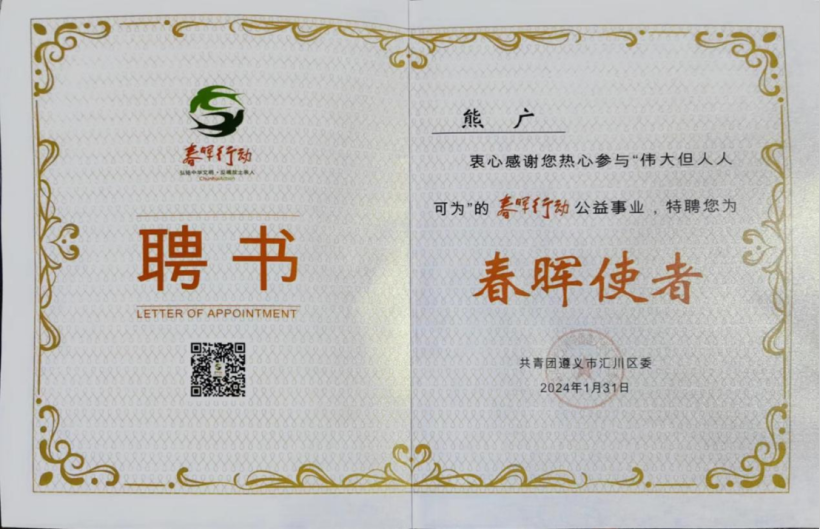 在2024年1月被聘为“春晖使者”,在我开心激动的同时,更多的是感恩,感谢春晖社这么好的平台,感谢春晖社的伙伴对我的鼓励与支持,让我可以在春晖社实现我的个人价值!聘为“春晖使者”,是对我的认可,也代表着我正式踏上春晖行动的征途,我会将这份认可转化到实际行动中,去书写更新更美的篇章!