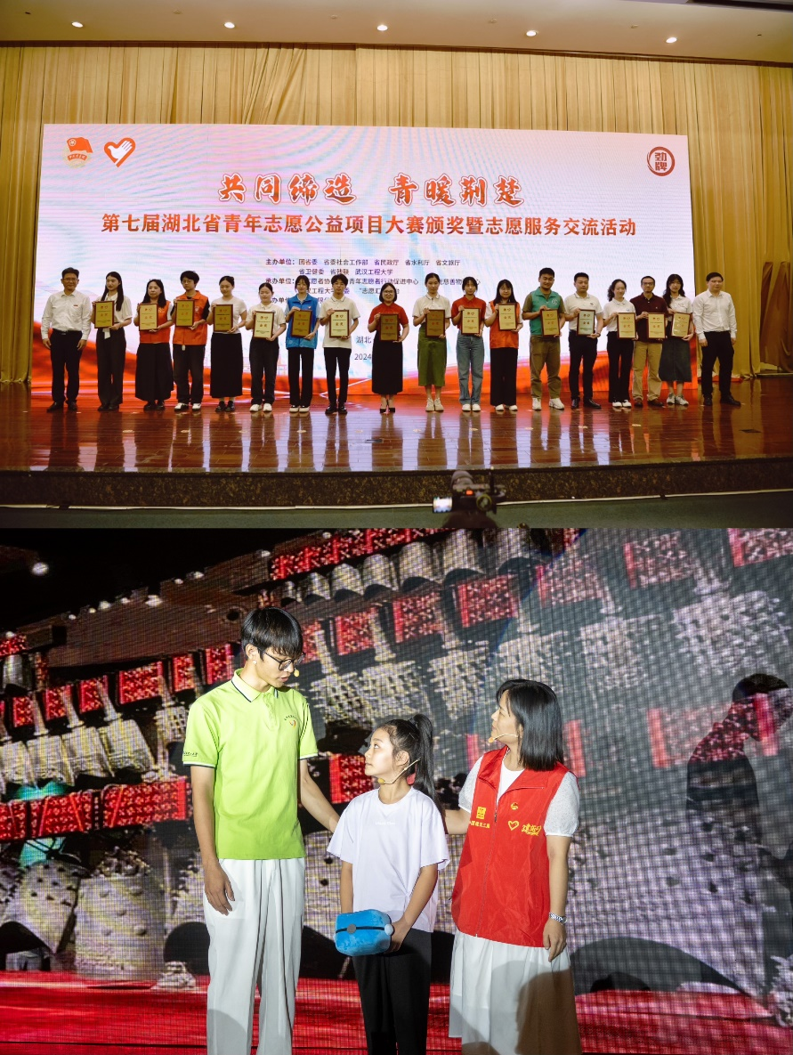 颁奖典礼上,“蓝宝守护,与‘理’同行”——校企联合关爱留守儿童志愿服务项目在大会上进行成果展示,通过互动讲述展示爱心结对、志愿帮扶的动人故事,获在场领导与观众的一致好评。《“小话筒”传递“大能量”—“红色小主播”全链条培养计划》、《蓝宝守护,与“理”同行——校企联合关爱留守儿童志愿服务项目》作为金奖代表上台领奖。